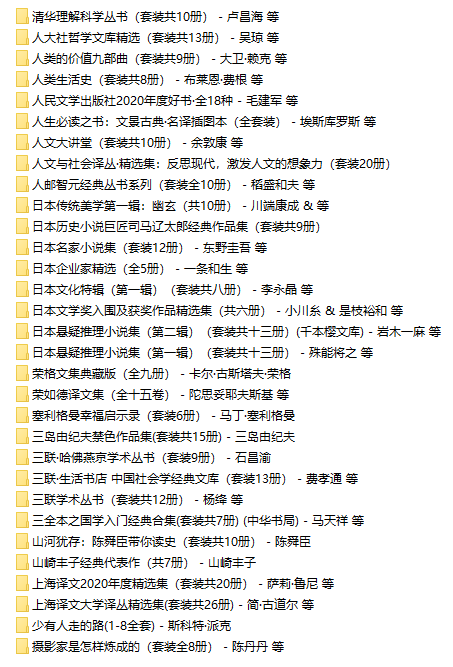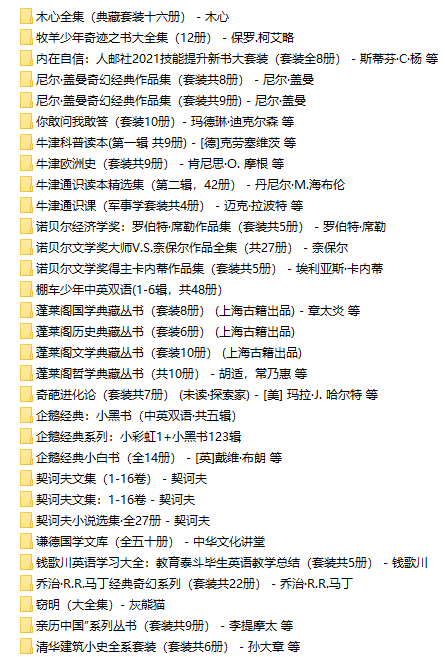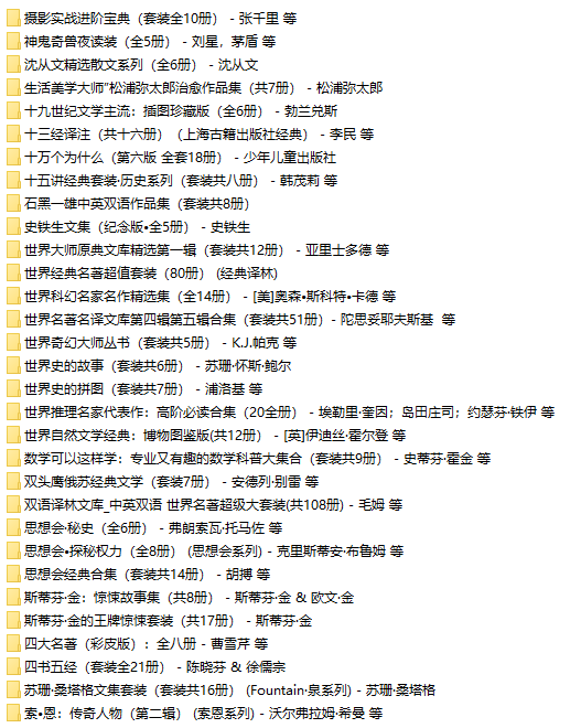 《套装图书》合集汇集数百套高质量电子书,全部配备 azw3、epub、mobi 三种格式,可在 Kindle、微信读书、多看阅读、掌阅等平台无障碍使用。内容覆盖 国学、人文、历史、哲学、心理学、文学、推理、科幻、奇幻、社会学、通识、艺术、教育、商业管理 等几十个知识领域。从经典必读名着到国际获奖作品,从学术严选到精装译丛,从科普入门到人文思辨,无论您是建立个人知识体系、进行深度研究,还是纯粹享受阅读乐趣,这套资源都是极具收藏价值与学习深度的“大型全门类电子书典藏库”。